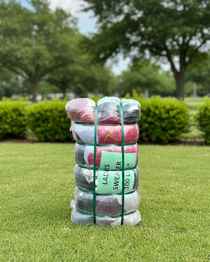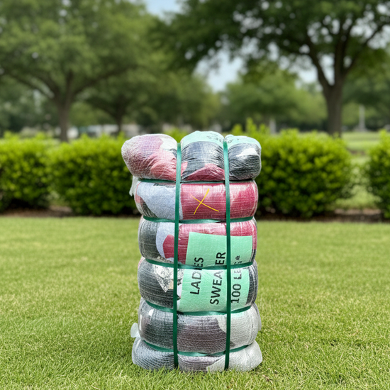 Paca de 100 lbs con suéteres para mujer en tallas y estilos variados.