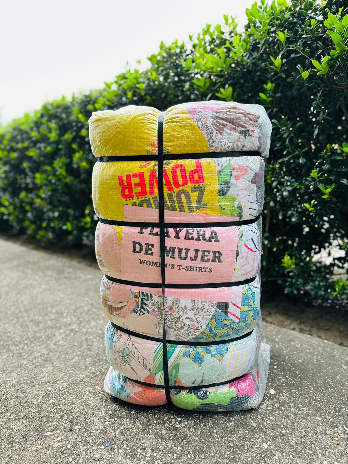 Paca de 100 lbs con camisetas de mujer en tallas y estilos variados. Calidad #2, ideal para la temporada de verano, con prendas cómodas y versátiles. Perfecta para reventa o surtido femenino económico.