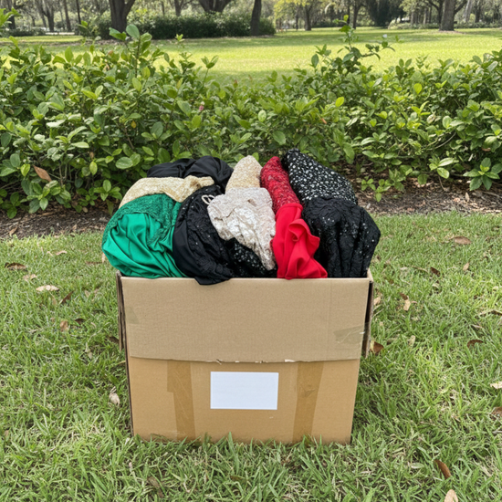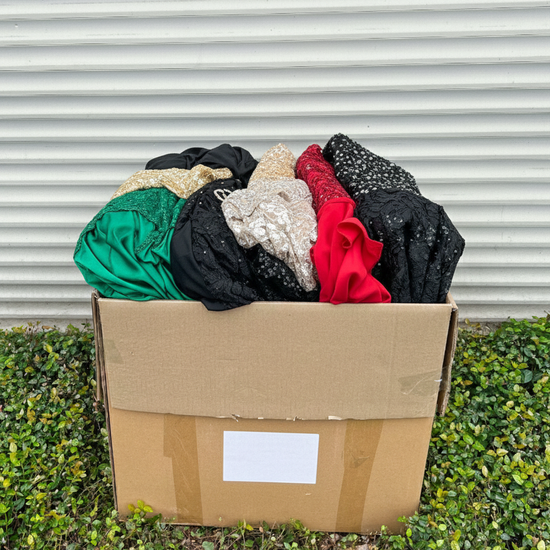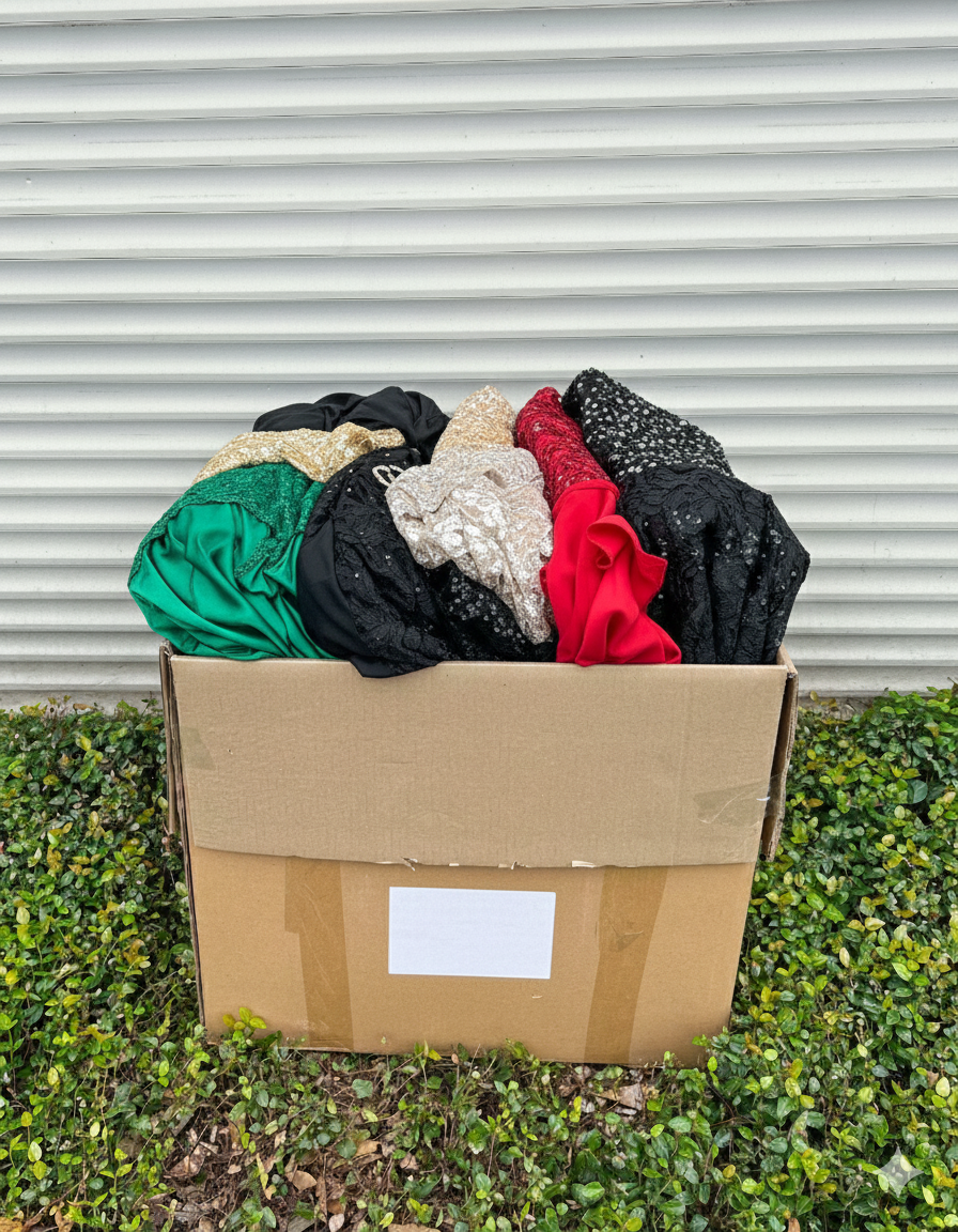 Caja de 50 libras de vestidos de fiesta nuevos.